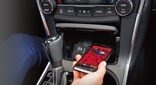 La Camry hybride XLE est dotée d'un système de recharge sans fil dans le bloc central qui vous permet de recharger vos appareils intelligents compatibles tout simplement en les posant sur la surface antidérapante du support de recharge sans fil Qi. C'est tout. Vous n'avez pas besoin de câbles!